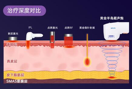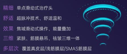 超聲炮選用的微點(diǎn)聚焦和大焦域的方法,實(shí)際上是沒法提升技術(shù)要求的讓步之舉。這類大區(qū)域加溫較為容易損害SMAS的附近組織,造成人體脂肪坍塌等問(wèn)題。