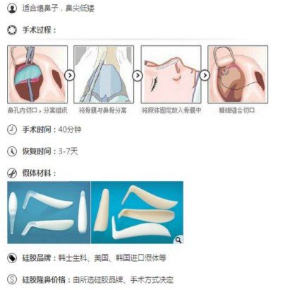隆鼻:使用的材料有兩種一種是自體組織,如自身軟骨和骨質(zhì);另一種是人造的物質(zhì)。鼻部塑形使用的材料多為硅橡膠和膨體類的材料,鼻塑形使用的材料多為自體或膨體聚四氟乙烯。