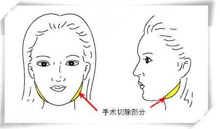 第二,在耳朵后面做一個(gè)切口,大概在耳垂后面。優(yōu)點(diǎn),手術(shù)與前一種方法相同,因?yàn)樗窃谕饷嫱瓿傻?,下頜角的整個(gè)部分都可以看到,而且是在直視下操作的。手術(shù)的操作比較簡(jiǎn)單,比切除容易,缺點(diǎn)也是一樣,因?yàn)槎浜竺鏁?huì)有一個(gè)疤,不太明X,很多人接受不了。